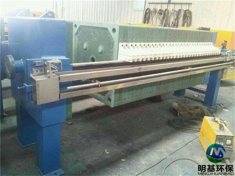 板框式压滤机主要由止推板(固定滤板)、压紧板(活动滤板)、滤板和滤框、横梁(扁铁架)、过滤介质(滤布或滤纸等)、压紧装置、集液槽等组成,其中过滤介质和集液槽由用户自备,也可由供应商代配。